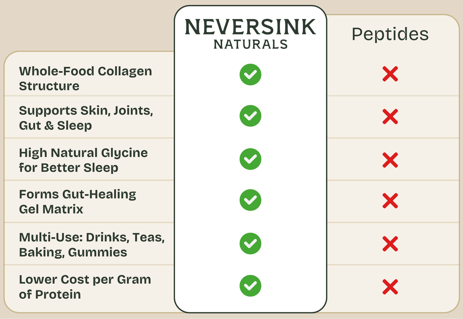 Both come from collagen, but gelatin is the whole-food form your body actually recognizes. While peptides are heavily processed and broken down, gelatin gives you:
